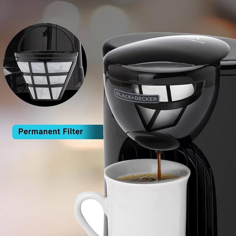 330 Watts power. The Black and Decker espresso maker comes with a 0.125L ceramic cup and has a 1 cup capacity, which makes it ideal for individual use. Using this coffee maker, you can prepare up to 180mL of espresso in one go. Also, the compact design of this coffee maker ensures that it occupies very little space on a kitchen countertop or any other surface. You can also carry it conveniently in a bag. Thus, whether you are a traveler or an espresso enthusiast, this coffee maker is what you need for a cup of warm, perfect espresso. Comfort and convenience. The Black and Decker portable coffee maker is very convenient to maintain. It is equipped with a pull-out filter holder that enables you to clean this espresso maker with remarkable ease. It also features a well-designed covered reservoir to maintain the highest level of hygiene to ensure that the user remains in sound health. Furthermore, this coffee maker also has a permanent filter, which is suitable for long-lasting use and can be used many times.