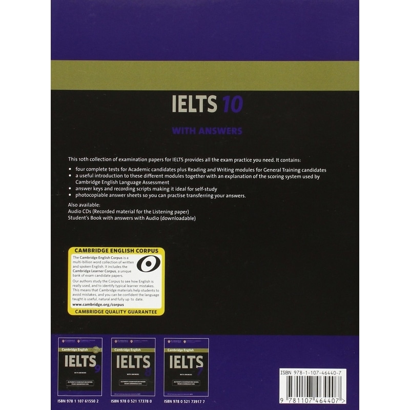 Cambridge IELTS 10 contains four authentic IELTS past papers from Cambridge English Language Assessment, providing excellent exam practice. The Student's Book with answers allows students to familiarise themselves with IELTS and to practise examination techniques using authentic tests. It contains four complete tests for Academic candidates, plus extra Reading and Writing modules for General Training candidates. An introduction to these modules is included in the book, together with an explanation of the scoring system used by Cambridge English Language Assessment. A comprehensive section of answers and tapescripts makes the material ideal for students working partly or entirely on their own. Audio CDs containing the listening material, and a Student's Book with answers with downloadable Audio are available separately.
