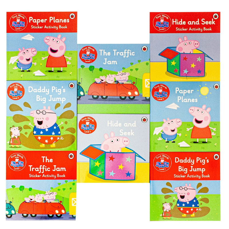 The four stories in First Words with Peppa Level 1 are: Daddy Pig's Big Jump, Hide and Seek, Paper Planes, and The Traffic Jam.