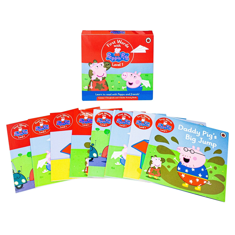 The five levels of First Words with Peppa are suitable for children aged 4-6, or younger if supported by an adult. This Level 1 Box Set includes four Storybooks and four Sticker Activity Books.