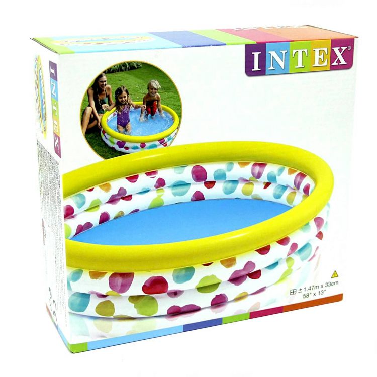 Great fun for the little ones with the Intex 3-Ring Pool Geometry. The Intex Pool with geometric patterns has a large water pleasure. His geometric patterns make it appear unique. The pool is made of durable vinyl and has a water capacity of approximately: 288 litres. There is also a repair kit included.
